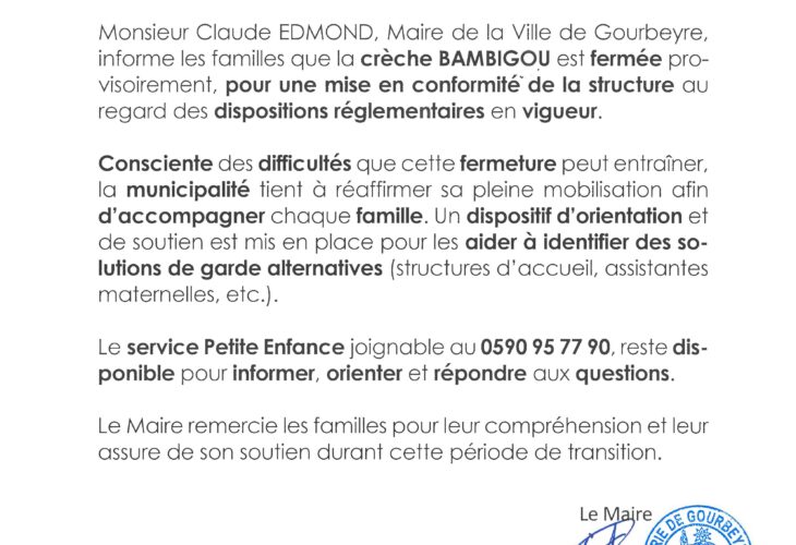 Communiqué – Fermeture de la crèche BAMBIGOU