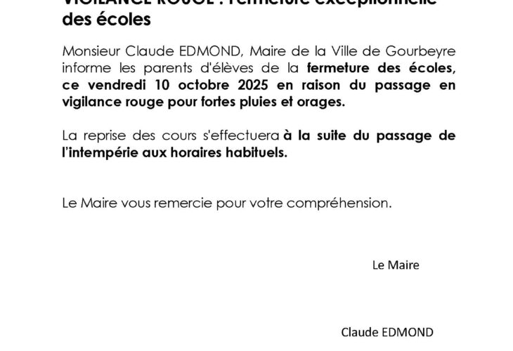 VIGILANCE ROUGE : FERMETURE DES ECOLES